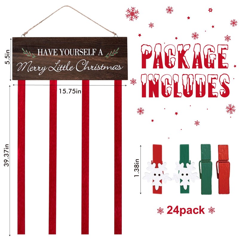 - 【Package Includes】You will receive a Christmas card holder with 4 ribbons, 24 various photo clips. The Christmas picture holder is measured 15.7*5.4in, the length of a ribbon is 39.4in, which will meet your needs for hanging more photos