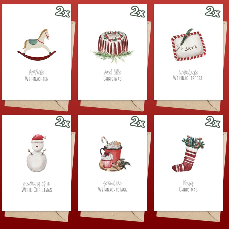 - What's in it: 12 x Christmas cards as folding cards set (DIN A6) on thick paper (350-400 g/m²) with 12 colour-matching envelopes (DIN C6).