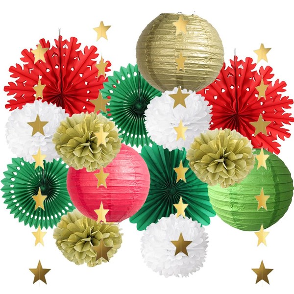 - 【Christmas Decorations Red Green and Gold Kit】 6pcs gold and white tissue paper pom poms, 3pcs red green and gold paper lanterns, 5pcs red and green paper fans, 1pc gold star garland