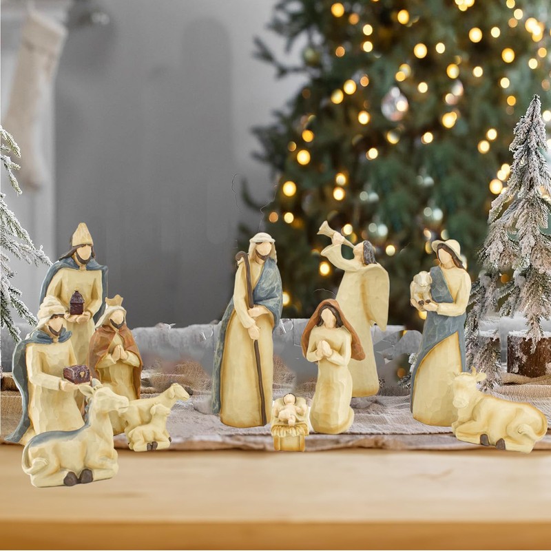 - UNIQUE DESIGN This 11-piece tabletop nativity set is a masterpiece of craftsmanship, featuring beautifully carved figurines that capture the essence of the Christmas story. Designed with minimal facial details and timeless wooden textures, it offers a universally relatable depiction of the Nativity.