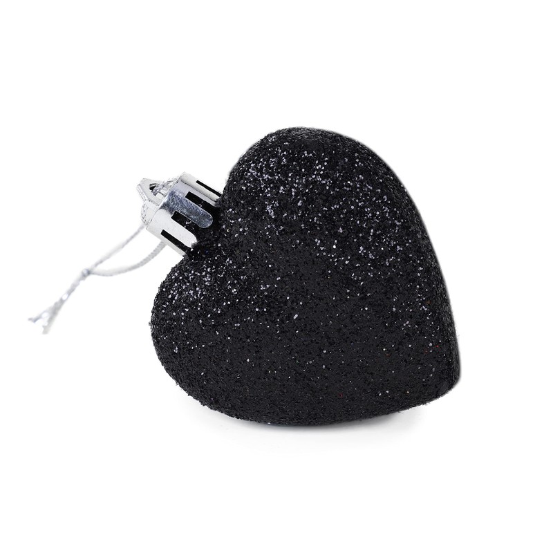 - This pack contains 8 heart baubles in total, decorated with a black glitter design.