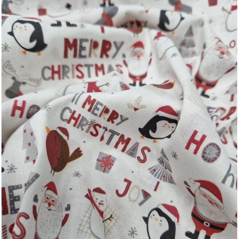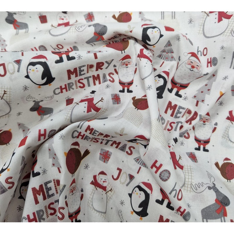 Christmas Fabric - Father Christmas Snowman Robin Reindeer Xmas Trees on White Craft Fabric Material Metre