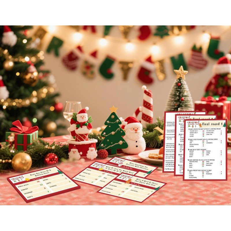 - 【Christmas Games Set】A set of Christmas family feud game that includes 12 question game cards, 3 final round cards,1 double-sided game introduction cards.