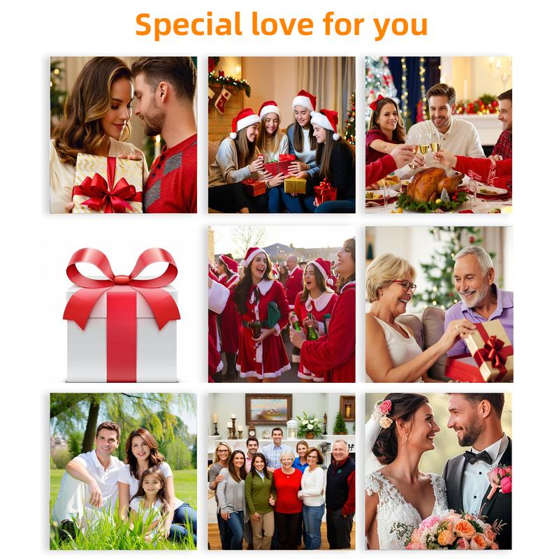 This 10.1-inch WiFi digital photo frame comes in three classic frame styles: white, wood, and black, with nine unique holiday gift box designs. It’s the perfect gift choice for Christmas, Thanksgiving, weddings, family gatherings, and pet memories. Easily upload and share photos through WiFi without any complicated setup, allowing your cherished moments to be displayed in your home effortlessly. The high-definition display brings each photo to life, offering a vivid and realistic visual experience. This frame is not only a wonderful way to showcase your memories but also an ideal gift for family and friends.