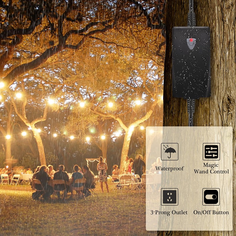 - WIRELESS REMOTE CONTROL: After plugging the light string into the receiver socket, just press the button quickly, the christmas tree magic wand can use the radio frequency to send commands to the receiver socket to turn on/off the lights on the Christmas tree, the remote control distance is 100 feet, you no longer need to go out of your house to turn on or off the lights