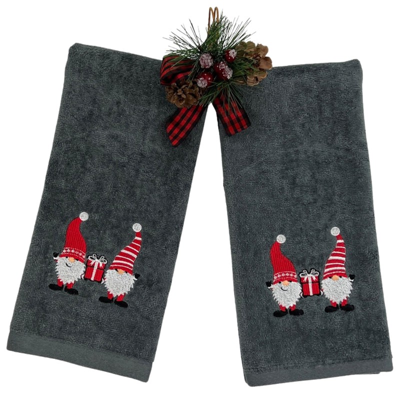 Christmas Gnomes Towel Set: Grey Hand Towels with Red White Embroidery Jolly Nordic Gnome