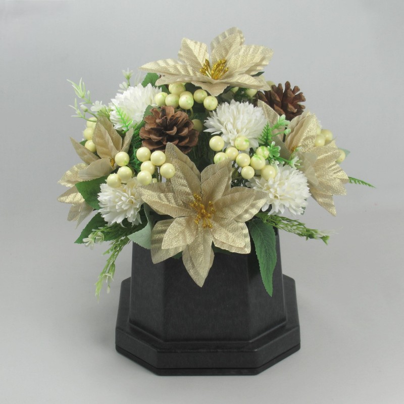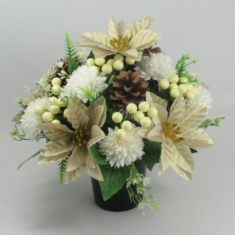 Christmas grave arrangement 25cm (10 inches) in grave pot/vase with with gold poisettias and snowball chrysanthemums
