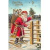 Christmas Greetings Red Suited Santa Claus Basket Fence Tree Postcard Copy