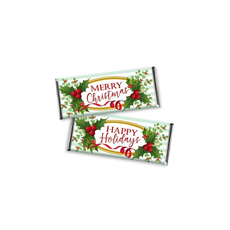 Christmas-Happy Holidays Candy Bar Wrappers for Chocolate Bar Favors-Mistletoe Holly Design-Season's Greetings-School-Class-Office-Client-Coworkers Inexpensive Gift (Set of 12) Chocolate Not Included