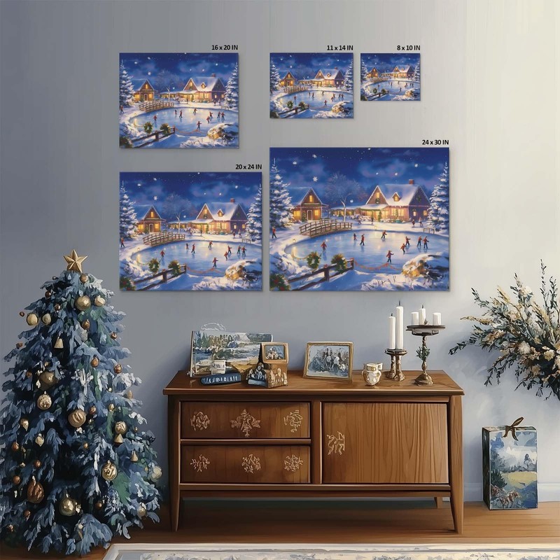 - Charming Winter Wonderland Scene – Bring the joy of the holiday season into your home with this enchanting canvas print featuring an ice skating rink surrounded by cozy cabins and festive lights.