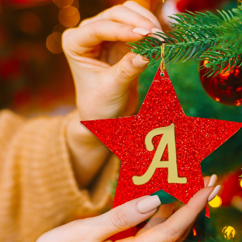 - Initial Acrylic Glitter Baubles for Christmas Tree Decorations: Every Christmas is a new beginning for human life. That is why we created this special personalised acrylic initial ornaments. Your Christmas tree will be very sparkly with Initial glitter Baubles on Christmas Eve. Buy one initial star ornament for each of your loved ones featuring the first letter of their name and hang them on your Christmas tree. This way, you can show the value you place on your loved ones on Christmas Eve.