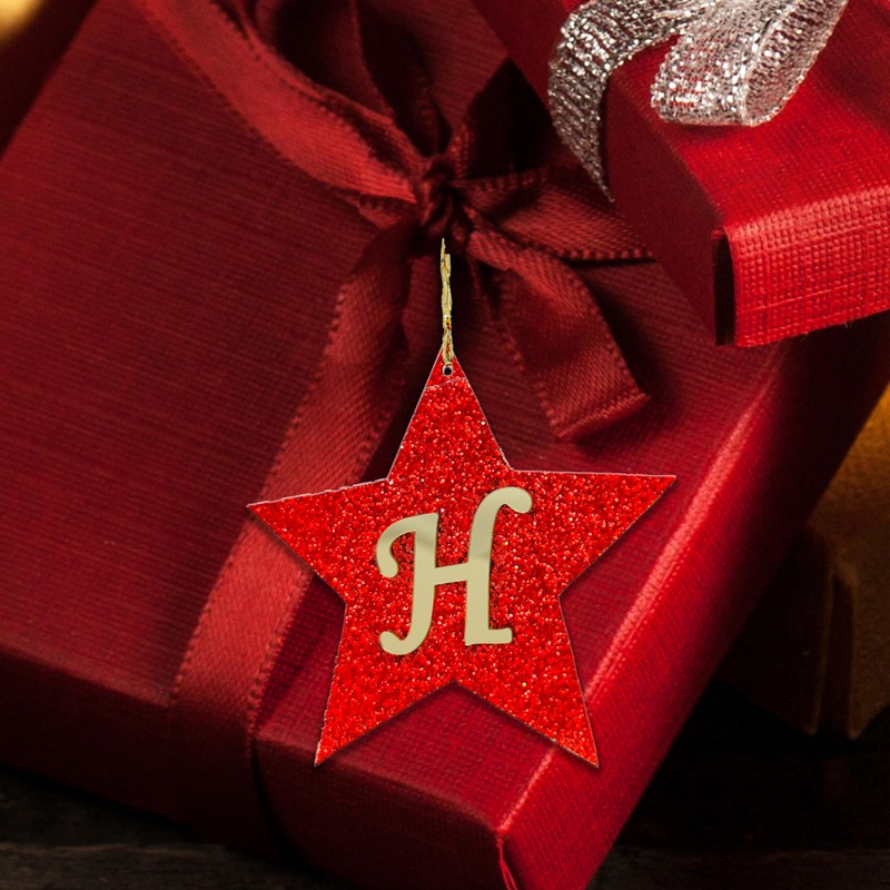 - Stylish Initial Ornament for Christmas Tree, Keychain, Stocking & Gift Packages Decor: These star shaped Gliter Ornaments can be used for different decorative purposes. You can use to decorate your Christmas gift's package or hanging your Christmas Tree. Your xmas package can be more stylish with glitter baubles. There is no limit to use this cute acrylic glitter baubles! Just choose your initial & make special the most important day of the year! Hanging initial bauble came with gold string.