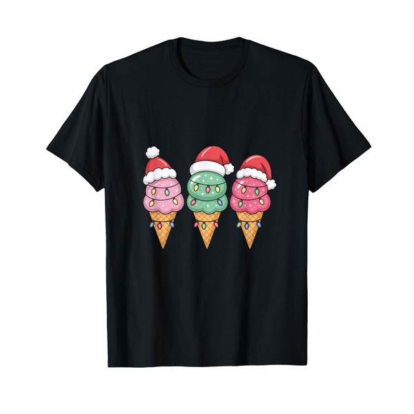 Christmas Lights Ice Cream Cone with Santa Hat Design T-Shirt