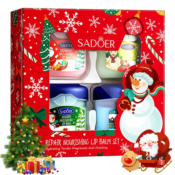 Christmas Lip Balm Set, 4 Packs Lip Balm Multipack, 3 Flavours Avocado, Strawberry, Kiwi, Reduce Lip Lines&Wrinkle, Lip Balm Gift Set for Cracked, Dry and Chapped Lips