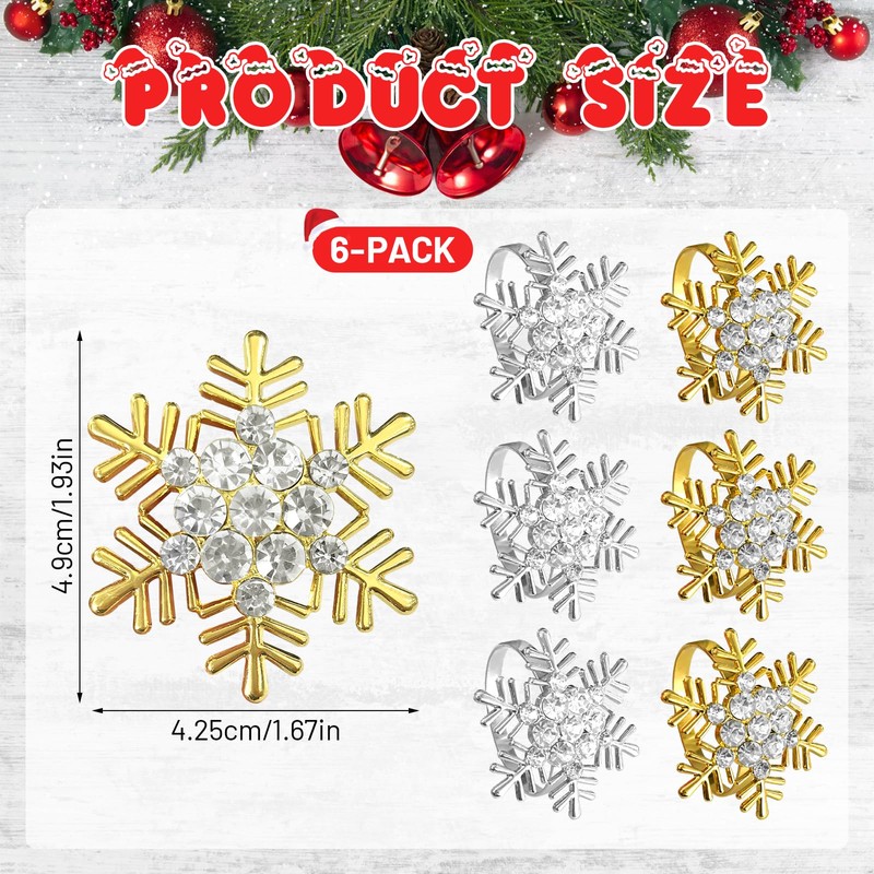 - Christmas Napkin Rings: Napkin rings are available in gold snowflake and silver snowflake to choice which can be perfectly matched with various table settings and napkins.