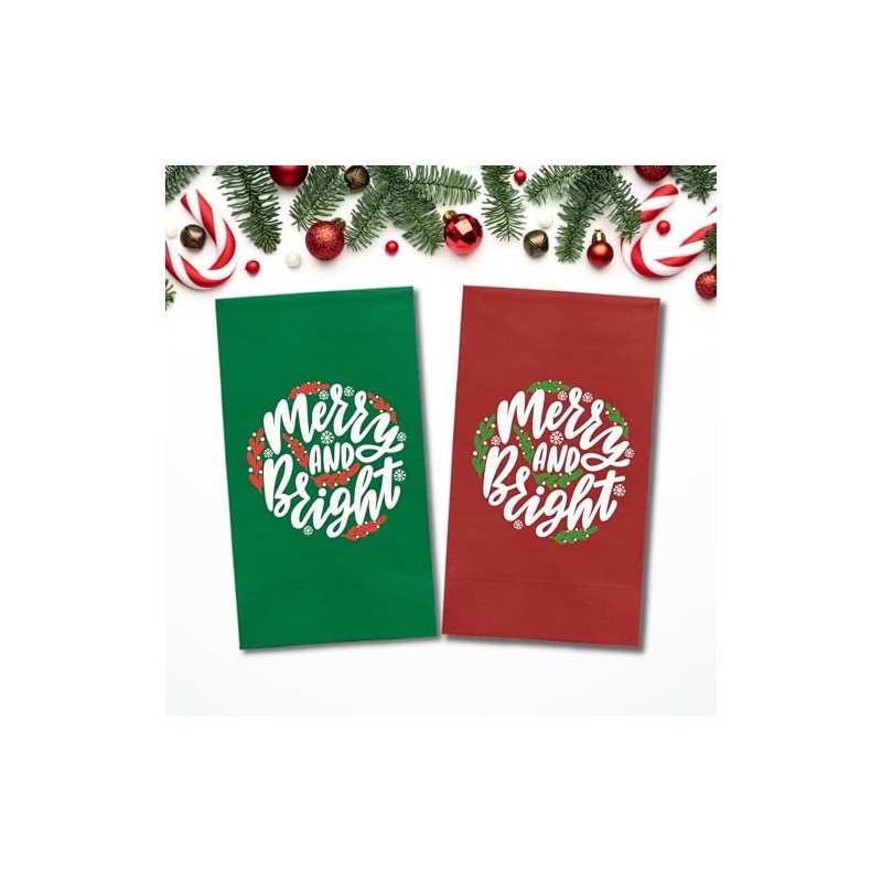 Christmas Napkins, Merry And Bright, Green and Red Paper Dinner Napkins, Christmas Table Decor and Guest Towels, Christmas Gift, Christmas Party Favors (48Pack (24 Red & 24 Green))