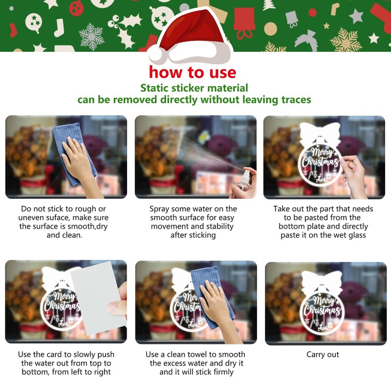 - クリスマスのウィンドウフィルム装飾は簡単に取り付けられます。静電気で吸着しますので、糊も必要ありません。シートからフィルムを剥がして窓に貼るだけです。