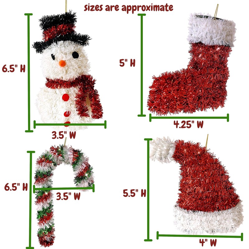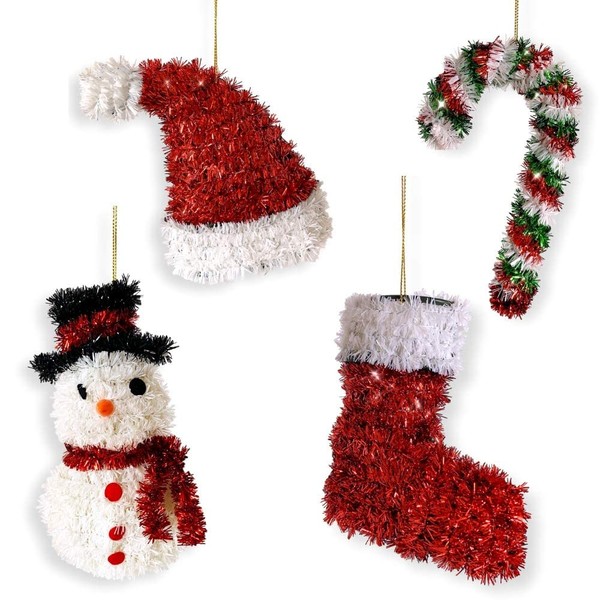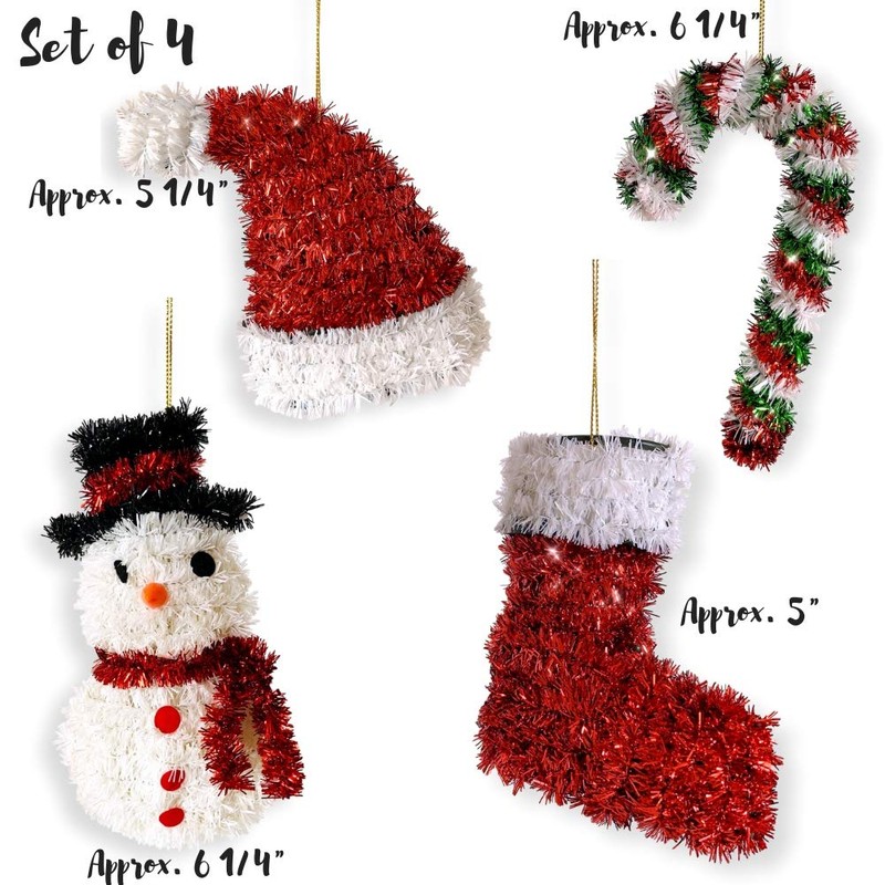 Christmas Ornaments - Snowman Santa Hat Candy Cane Stocking - Sparkly Tinsel Xmas Tree Ornaments - 4 Pcs.