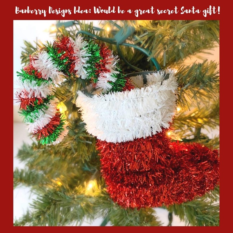 - XMAS GIFT EMBELLISHMENTS. Anyone who loves or collects ornaments will have to have this cute ornament set. This set is perfect for gift giving for house warming, the newly married couple, gift exchange at work or present for your favorite school teacher. Also, a nice hostess gift at a holiday party. These ornaments are so sparkly and fun. They glisten on your tree when your Christmas lights are on. They are made of shiny tinsel in red, green and white colors.