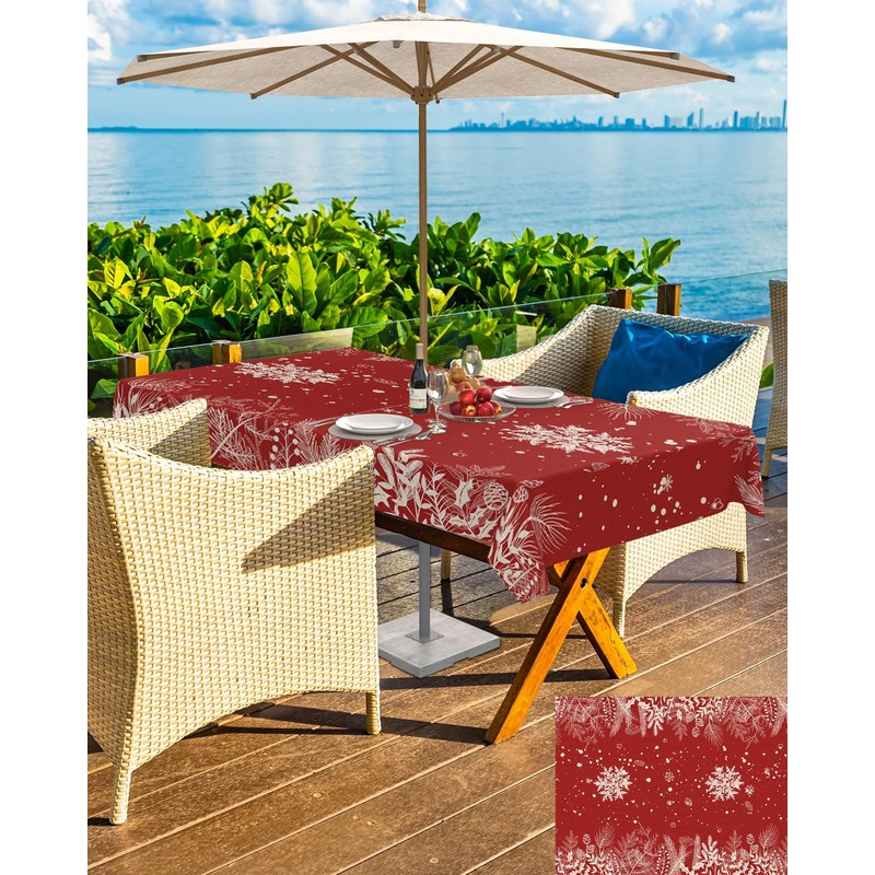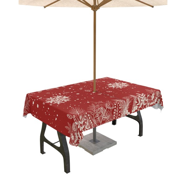 Christmas Outdoor Tablecloth with Umbrella Hole, Waterproof Zippered Table Cloth for Rectangle Tables Snowflake Red Trees Plants Tabletop Collection for Patio, Garden, Picnic, Camping 60 x 84 inch