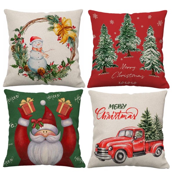 Christmas Pillow Covers 18x18 Set of 4 Red Christmas tree Pillow Cases Merry Christmas Truck Santa Claus Winter Holiday Decor Throw Cushion Case for Home Outdoor Couch Covers Decorations 18inches