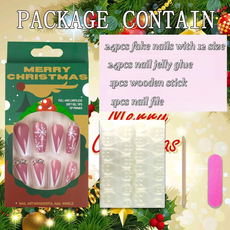 - 【Includes Tool Kit】You'll get 24 cute Xmas false nails in 12 sizes. 1 mini nail file, 1 small wooden stick, 1 piece of nail glue sticker. Christmas glue on nails are perfect for most people's nails.