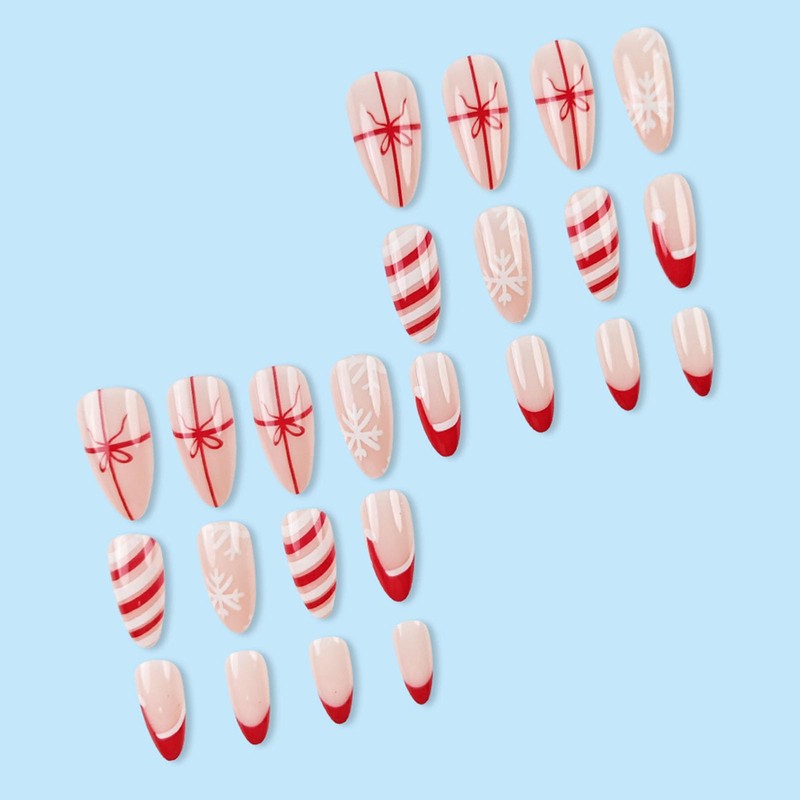 Christmas Press on Nails Medium Almond Fake Nails with Bow Snowflake Santa Hat Designs Red French Tip Nails Press ons Glossy Glue on Nails Nude Artificial Stick on Nails for Women 24Pcs