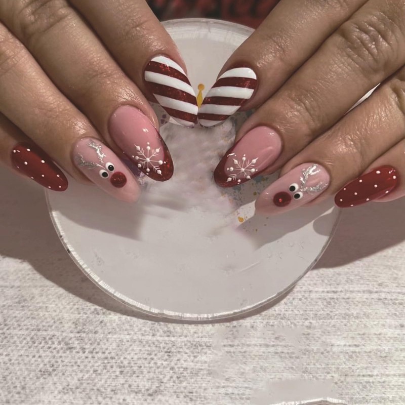 Christmas Press on Nails Medium Almond Fake Nails with Elk Design Snowflake Glue on Nails Red White Stripes Stick on Nails Glossy French tips False Nails Cute Winter Nails for Women Girls Manicure