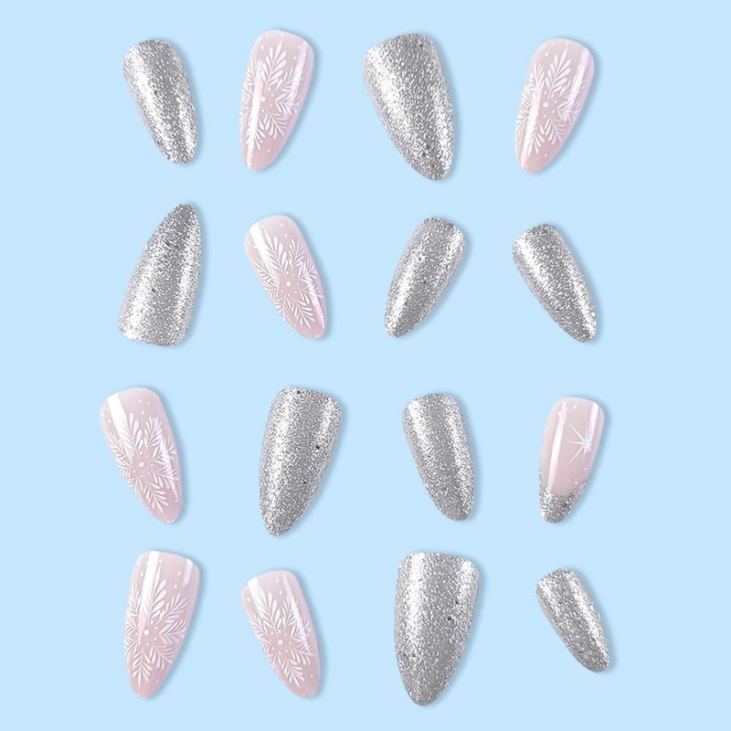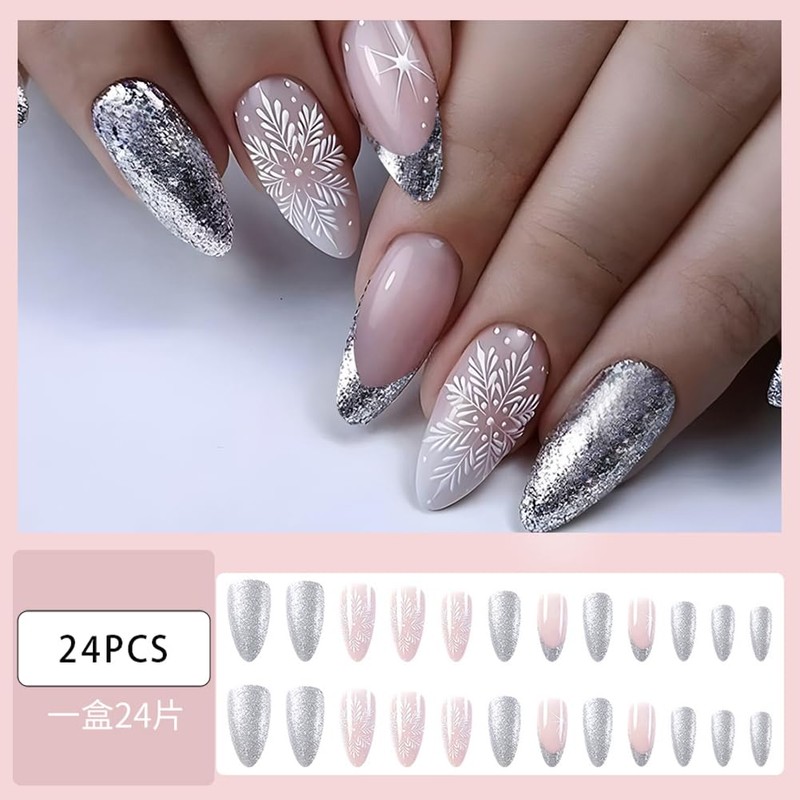 Christmas Press On Nails Medium, Christmas Fake Nails With Glue, Artificial Christmas Nails Glue On, Christmas Nails Press On With Glitter Sequins Snowflake Design,Stick On Nails for Women-24Pcs