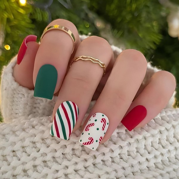 Christmas Press on Nails Square Short Fake Nails Matte Glue on Nails Green Acrylic Nails Cute False Nails with Stripe Candy Cane Designs Red Full Cover Artificial Stick on Nails for Women 24Pcs