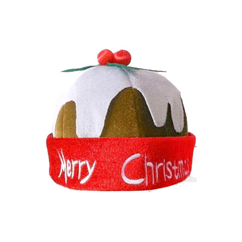 - Plush hat shaped like a Christmas pudding with padded rim and holly design on the top