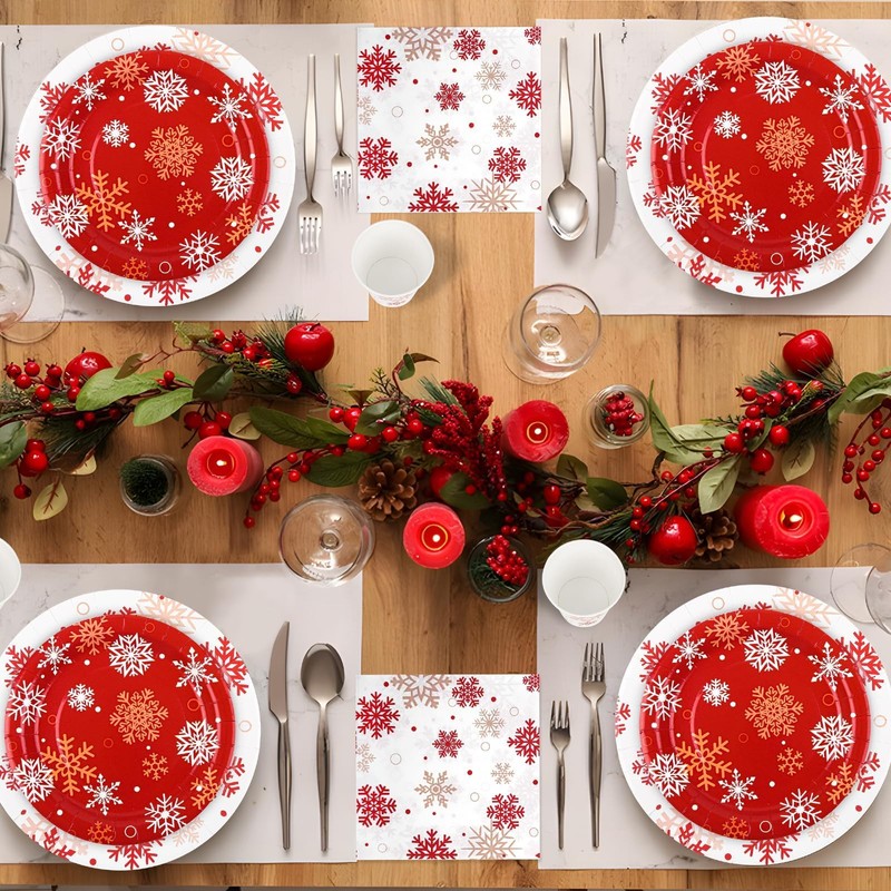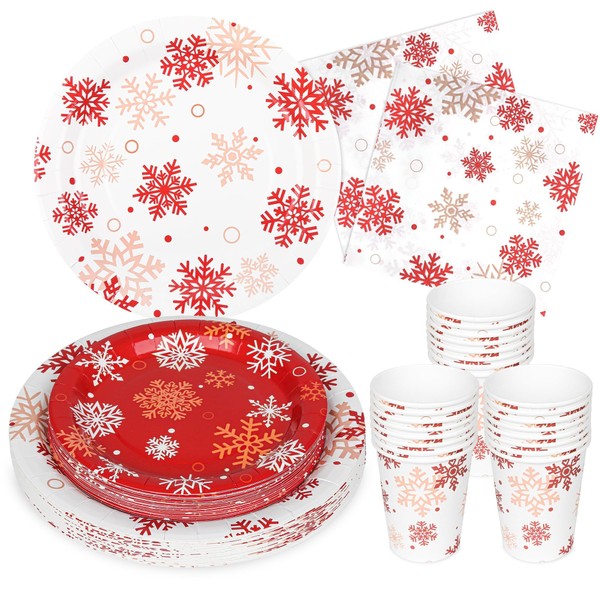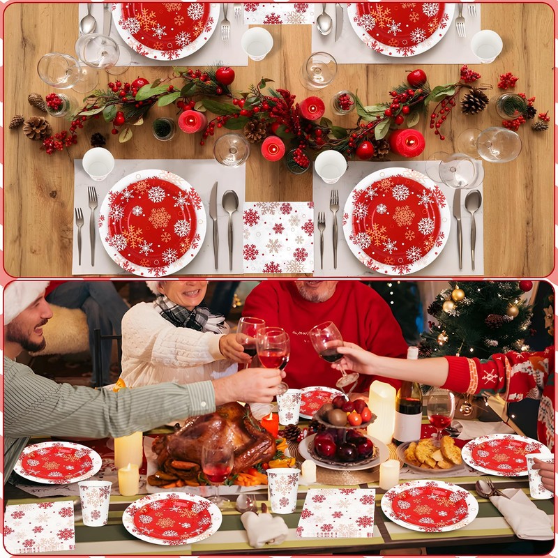 - Christmas Snowflake Paper Plates---Complete set with 9"Christmas plates *25, 7"red snowflake plates *25,6.5" napkins *25,9 oz xmas cups*25,serve 25 guests. Sufficient quantity can meet your Christmas party supplies needs and also enough for party usage needs, your guests will love decorative disposable red and white christmas plates and napkins.