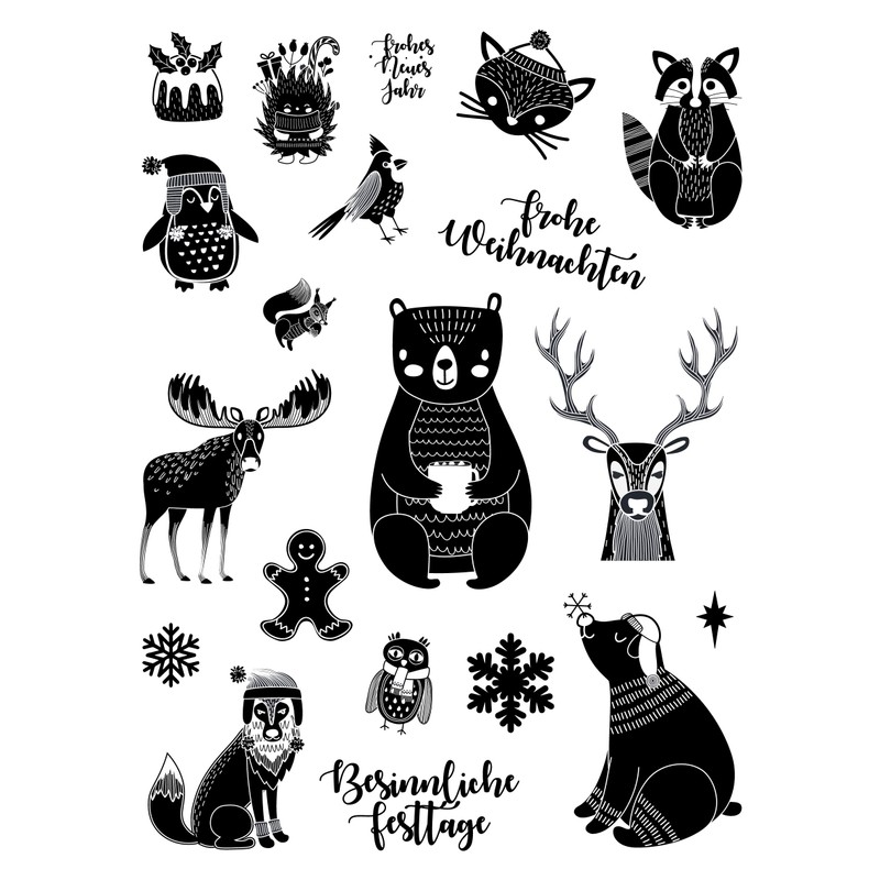 - High-quality silicone stamps around the theme of Christmas: "Merry Christmas", "Merry New Year", "contemplative holidays", snowflakes, stars, trees, reindeer, deer head and cute winter animals with gifts and winter hats and scarf: raccoon, bear, penguin, owl, dog, fox, badger, hedgehog, bird, elk
