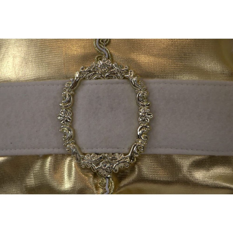 - FESTIVE OUTFIT: Elegantly dressed in a gold-on-white paisley coat with furry white trim over a golden satin suit. White fleece mittens and boots complete Santa's elegant style. (Measures 10.5"D x 17"W x 36"H)