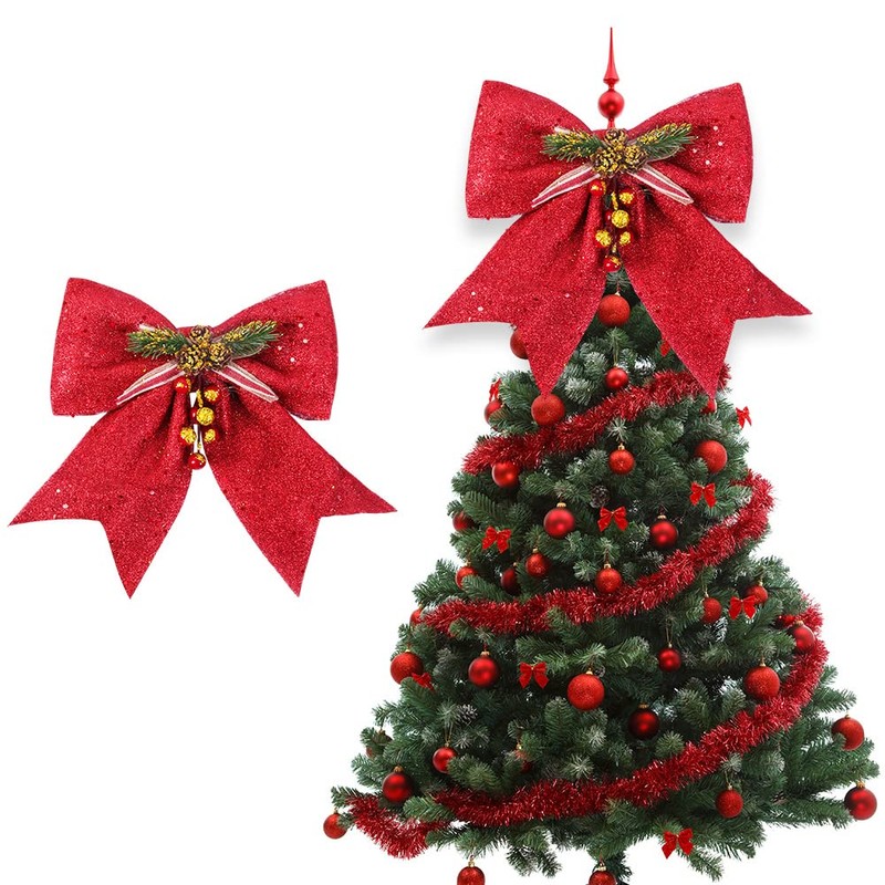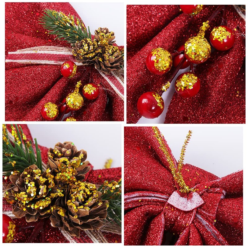 - Shiny Designs: The surface of red bow is covered by red sequins and designed with some small decorations like pine needles, pine cones, red berries. Very shiny and cute Christmas tree decorations.