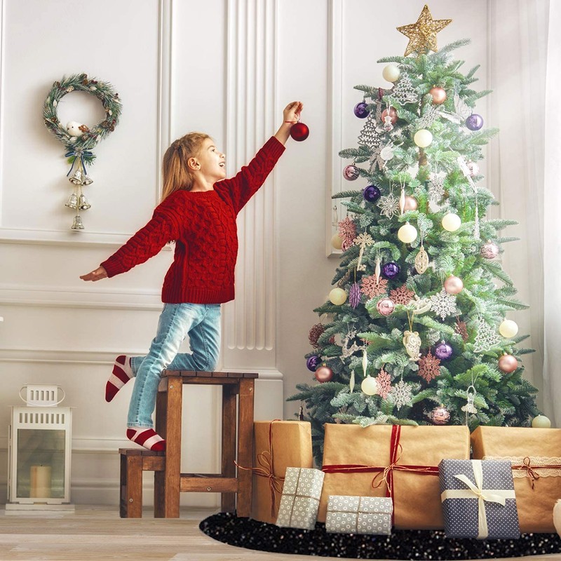 🎁1. Size & Color -- You will receive a 36 inches diameter black glitter cute tree skirt, fits under 6 foot tall trees. You can put some gifts, Christmas boxes, Christmas balls on the personalized Christmas tree skirt.