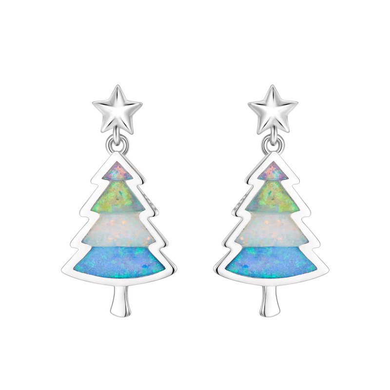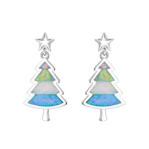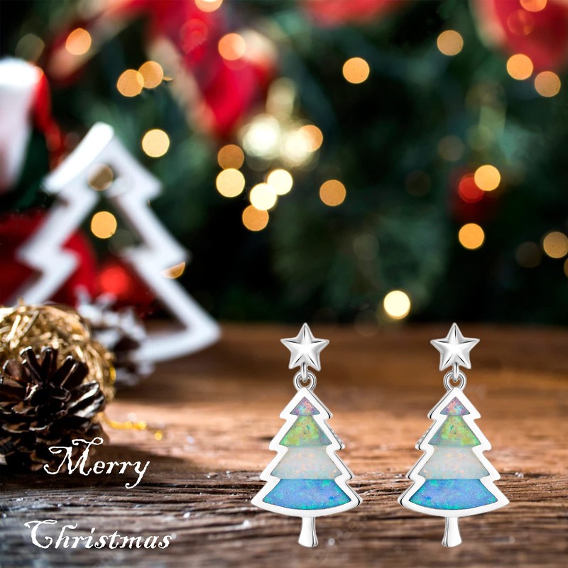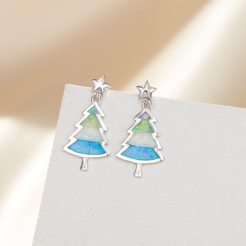 Christmas Tree Stud Earrings for Women Girls, 925 Sterling Silver Created Opal Evergreen Earrings