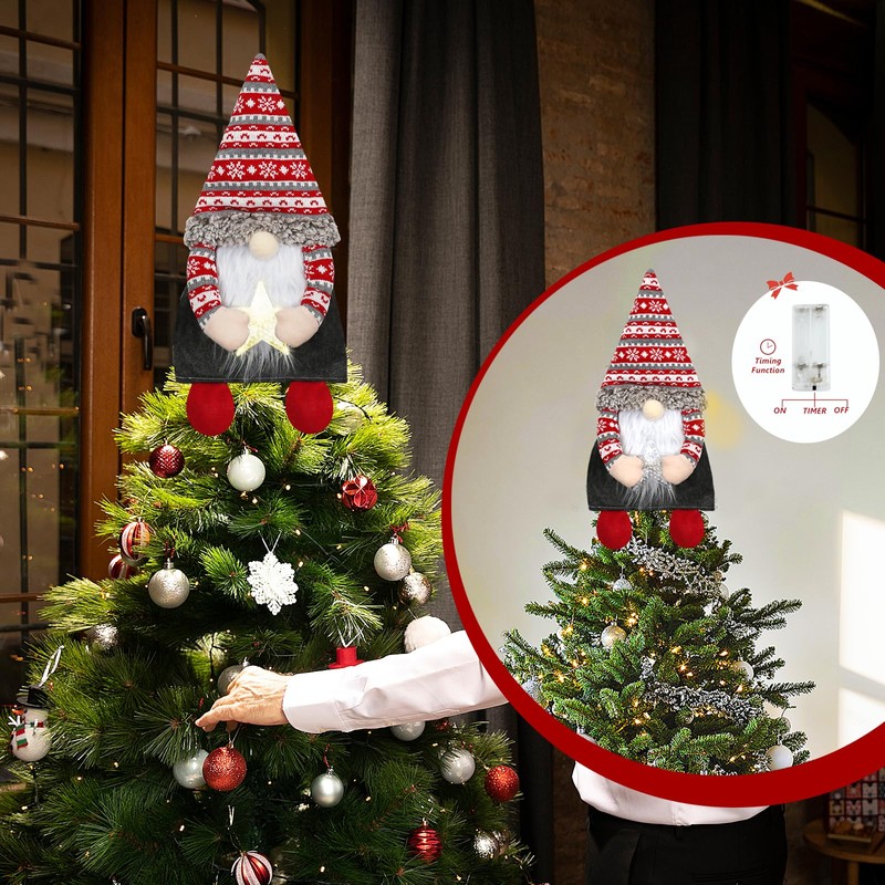 Christmas Tree Topper with Lights,Gnome Tree Topper with Lighted Star Funny Tree Toppers Christmas Decorations Battery Operated Tree Topper with Timer-Red