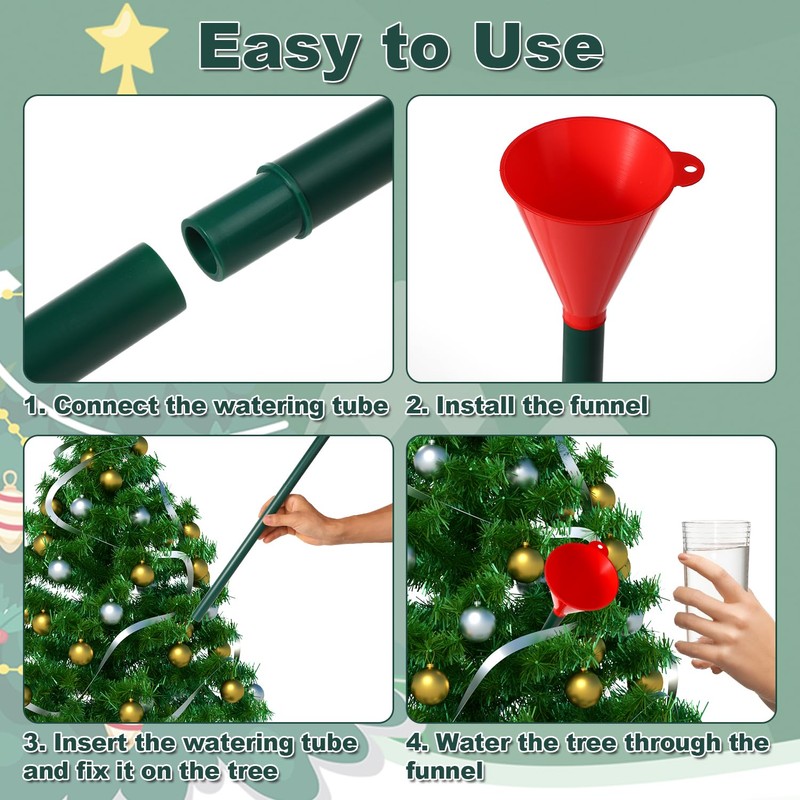 - Product Included: You will receive 1 set of christmas tree watering system, including 1 piece of red funnel, 3 pieces of green long tubes and 2 pieces of connectors.