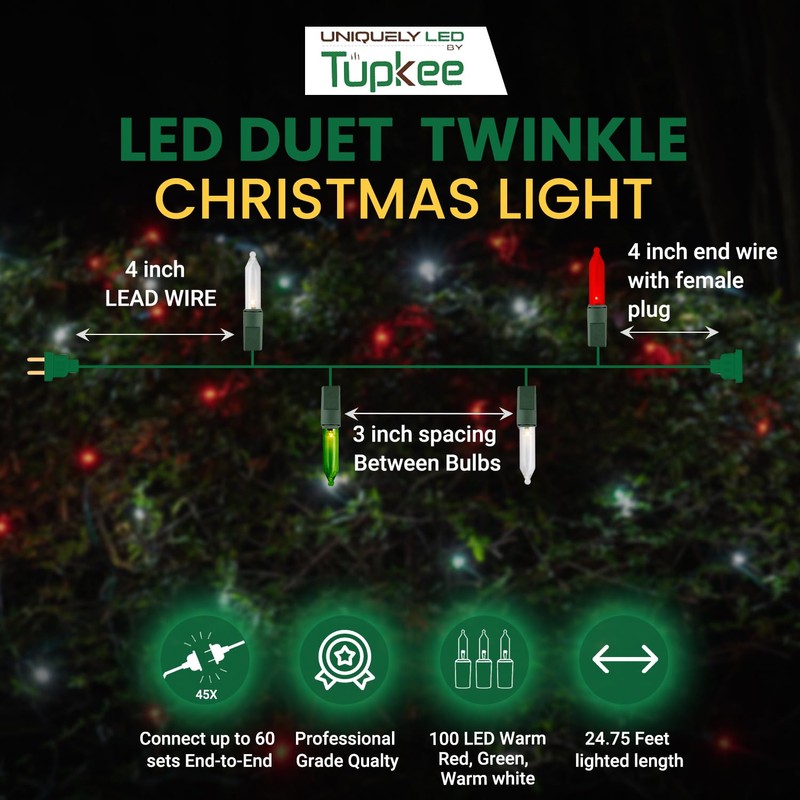 - LIGHT LENGTH – 24.75 Feet lighted length – 3 inches spacing between bulbs - Connect up to 60 sets End-to-End (Total 1,485 Feet) - 100 LED Red /Green / Warm White bulbs twinkling lights