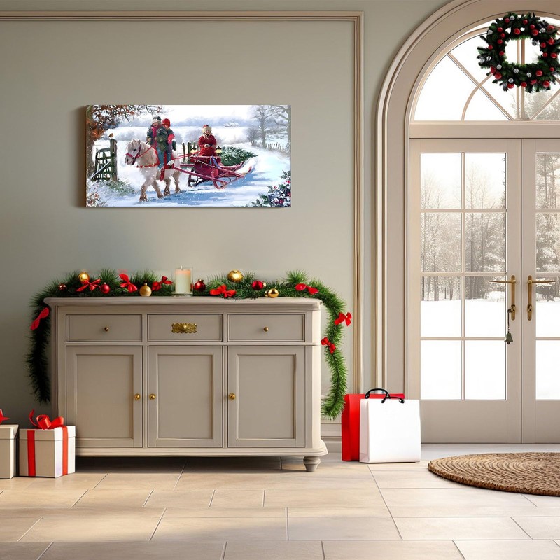 Christmas Wall Art Christmas Sleigh Ride Pictures Print Holiday Canvas Art with Pony and Children Canvas Artwork for Bedroom Living Room Winter Wall Décor 10x20inch