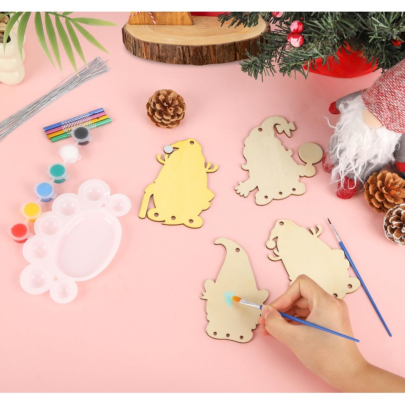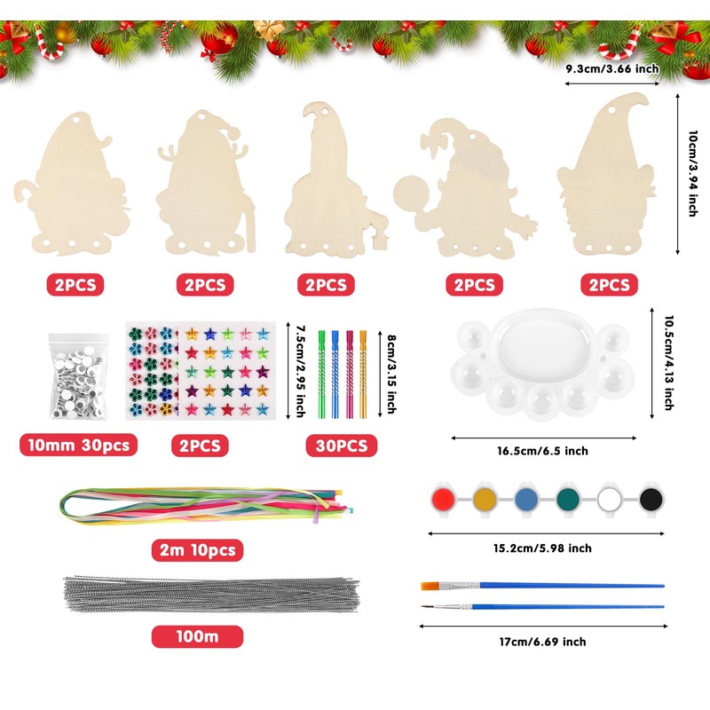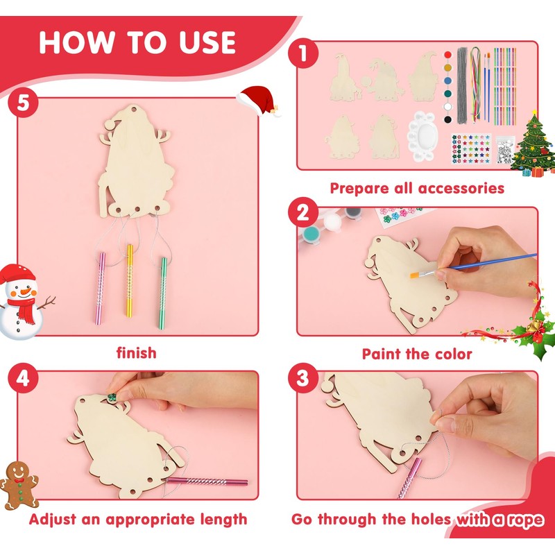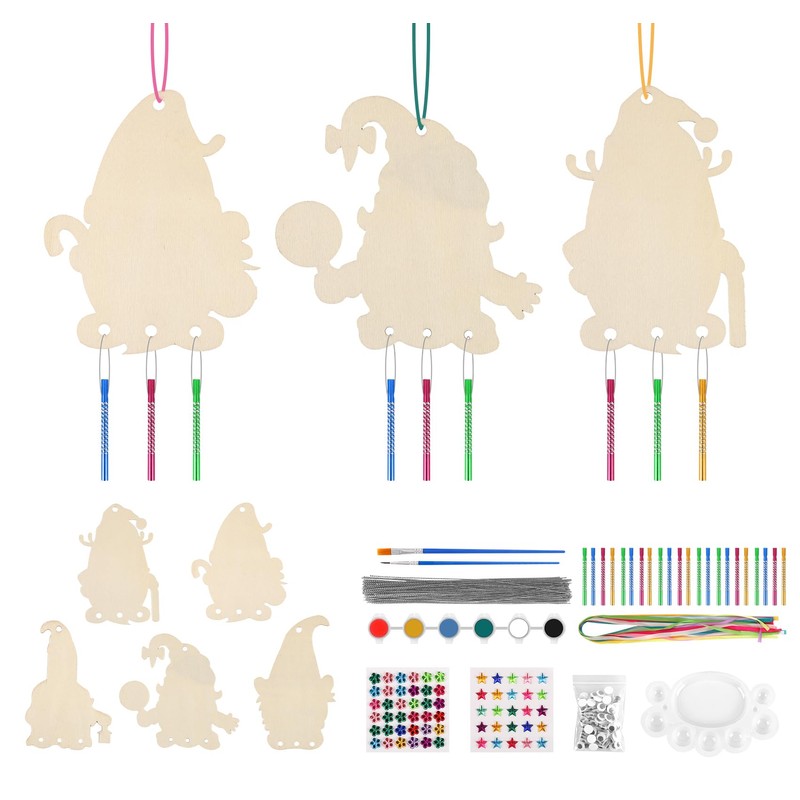 - Christmas Wind Chime Kit:Kids DIY dwarfs-shape Christmas wind chime set includes 10 pcs unfinished wooden , 30 pcs wind chimes, 2 coloring brushes, 6 kinds of paints, 100m silver wire, 10 colorful cords, 2 sheets of colorful diamond stickers,1 paint palette, 30 eye stickers. Ample quantity and various styles to meet your decoration needs, kids can make their own wind chime set to Christmas decorations.