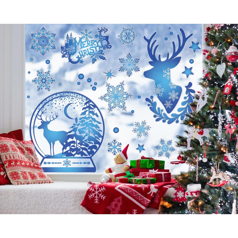 Christmas Window Clings 4 Sheets,Christmas Decals Decoration Double-Sided Static Window Stickers,Removable Christmas Window Decorations for Glass Windows Xmas Holiday Home Office Decor - Blue Elk
