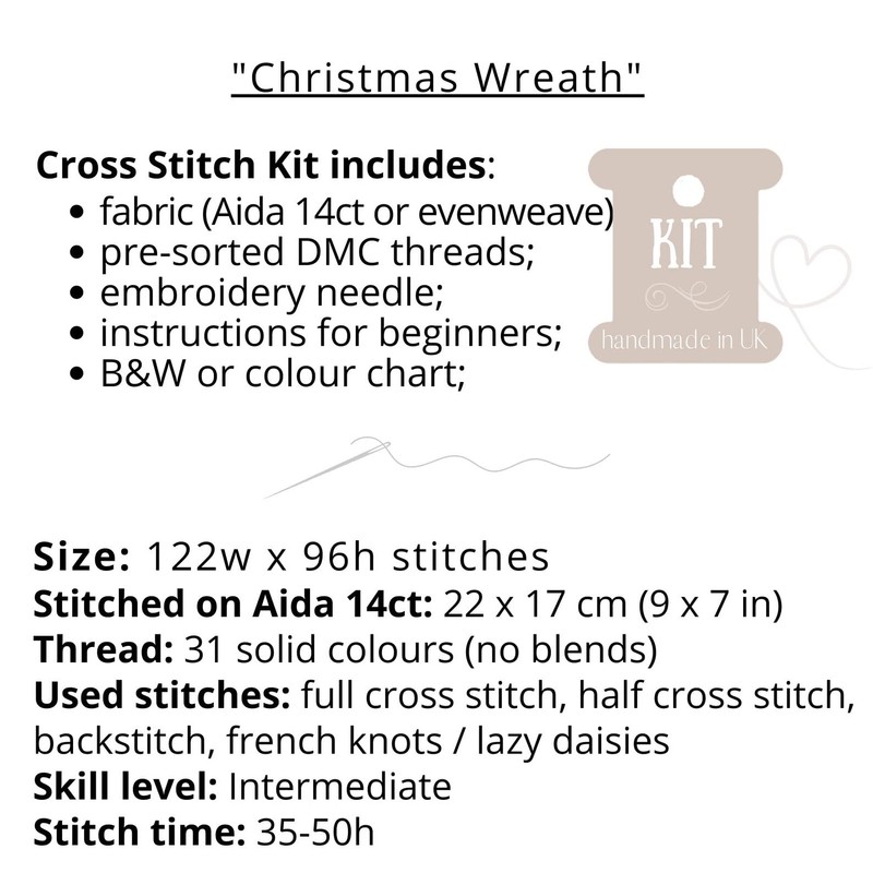 - CROSS STITCH KIT INCLUDES: quality fabric (DMC Aida 14ct), finest DMC stranded cotton, needle, full instructions, large and clear colour chart, separate backstitch chart (please send a dm with your order if you prefer B&W charts). Single-page PDF for Pattern Keeper available on request with any kit.