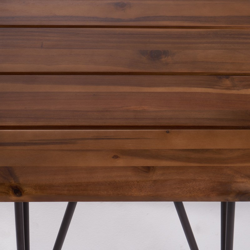 - This rustic, industrial accent table is a great addition to any industrial decor setup that you might have. Featuring an acacia wood table Top on iron legs for a true, authentic rustic feel. This accent table is both sturdy and stylish, the perfect combo for any set in Need of a accent table. You will be very happy with this acacia wood accent table