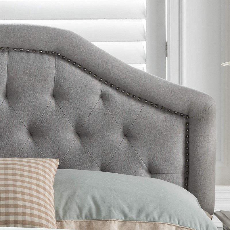 - If you are looking for smooth, simple lines to help lull you to sleep, than look no further than this headboard. Featuring a studded seam, this headboard is ideal for any bedroom. Its iron legs also help insure that you can attach it to any bed frame imaginable.