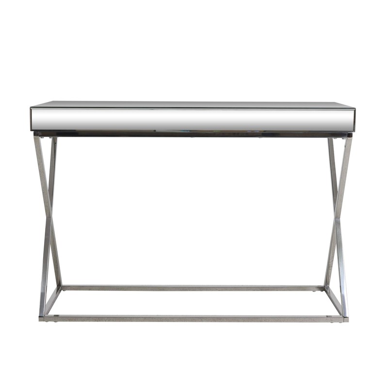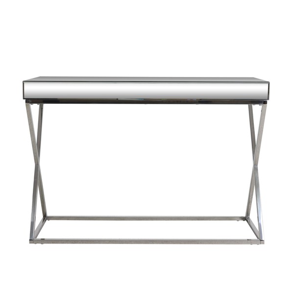 Greet your guests when they enter your home with a striking conversation piece that you can also use as a perfect stage for your photos and decor. Crafted from illuminating mirror and stunning steel, our console table is the perfect interior accessory for a home looking for a dazzling modern glam look. Whether you are using this in your living room or foyer, this elegant accessory allows you comfortable table space and a place to store your keys and other items whenever you need it. Includes: One (1) Console Table Top Material: Mirror Leg Material: Stainless Steel Finish: Mirror Leg Finish: Silver Hand-Crafted Details Assembly Required Dimensions: 13.30 inches deep x 45.30 inches wide x 30.00 inches high