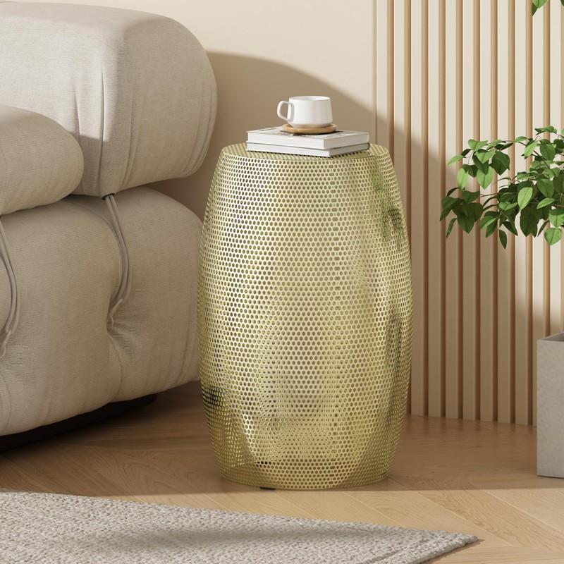 - 【Lace Cut Hollow Iron Side Table】This side table set boasts a sleek gold finish with an openwork design that features captivating style. The drum shape design brings unique appeal and enhances the overall look of the setting