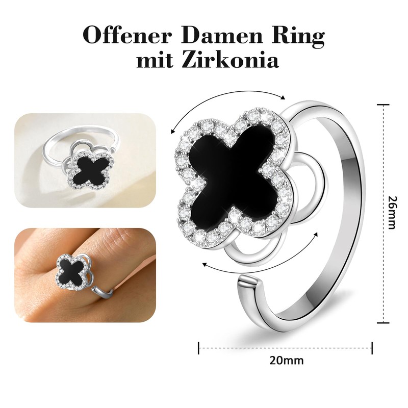 - Zircon and natural shell setting: the clover ring shines with zirconia stones and natural black shells. The shells are equipped with a protective film that protects against scratches and can be removed if necessary. This 925 silver women's ring is characterised by its unique design and will attract attention on most occasions.