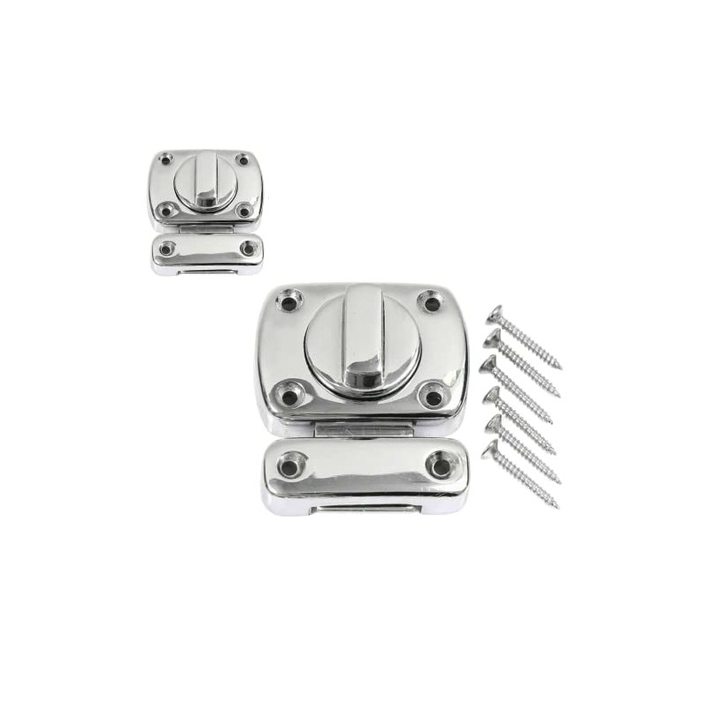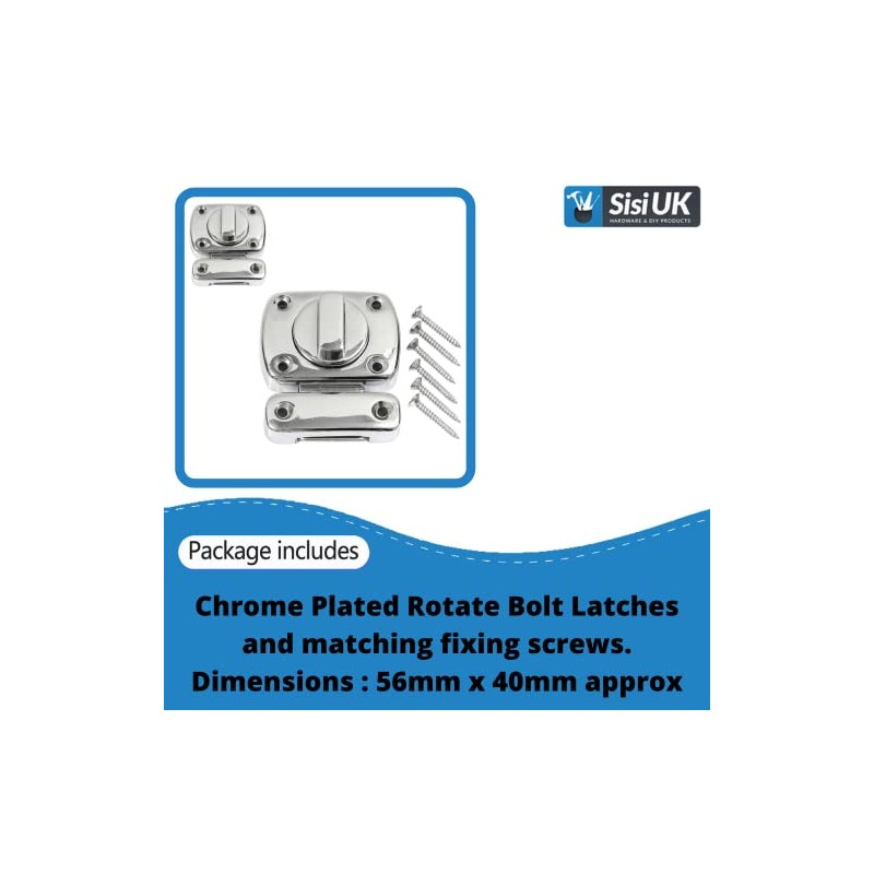 • Package Contains: 1 Piece of Chrome Plated Rotate Bolt Latches and matching fixing screws. Dimensions : 56mm x 40mm approx, Receiver Dimensions : 53mm x 16.5mm approx Weight:120gram.